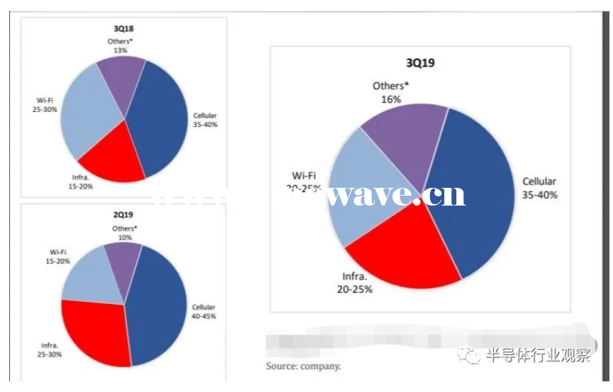 2019年,路由器主芯片開(kāi)始集成5.8G PA,WIFI PA需求減少。手機(jī)上,除了蘋(píng)果繼續(xù)采用Murata的砷化鎵WIFI PA,其他手機(jī)廠商已經(jīng)轉(zhuǎn)向SiGe工藝的WIFI FEM,因此2019年前兩季度WIFI PA所需的砷化鎵晶圓下降。隨著WIFI6的到來(lái),砷化鎵WIFI PA的需求大幅增加,對(duì)應(yīng)的砷化鎵晶圓消耗量在2019年Q3季度又占到20-25%,比手機(jī)PA少了15個(gè)百分比,手機(jī)PA占比為35-40%。